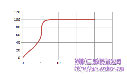 從圖中我們可以看出,固化并非是勻速的,剛開始固化稍慢,大約5s的時(shí)候,反應(yīng)速度加快,大概在7s左右時(shí),固化完全。這可能是因?yàn)閯傞_始碳碳雙鍵在打開時(shí)需要吸收部分能量,而交聯(lián)過(guò)程相對(duì)較快。
